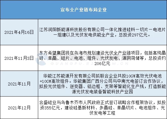 令市场震惊的还有一波接一波的全产业链重磅投资。2021年4月,润阳新能源宣布投资297亿元,一体化推进硅料、切片、电池片、组件及光伏发电供能全产业布局。11月,硅料龙头东方希望称,计划投资约206亿元在乌海市建设高纯晶硅、单晶、硅片、电池、组件、光伏发电、源网荷储等光伏全产业链项目。同月,华能大踏步的向光伏全产业链迈进,参与投建电池、组件、逆变器、铝边框、支架、光伏发电等全产业。近期,合盛硅业宣布与乌鲁木齐市人民政府正式签订战略合作框架协议,拟投资355亿元建设20万吨多晶硅、单晶切片、电池组件、光伏发电等工程。