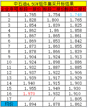 同日,吉林油田光伏组件物资采购招标项目公布中标候选人,天合、隆基、晶科、晶澳为中标候选人,中标价格分别为1.95元/W、1.996元/W、1.96元/W、1.988元/W。