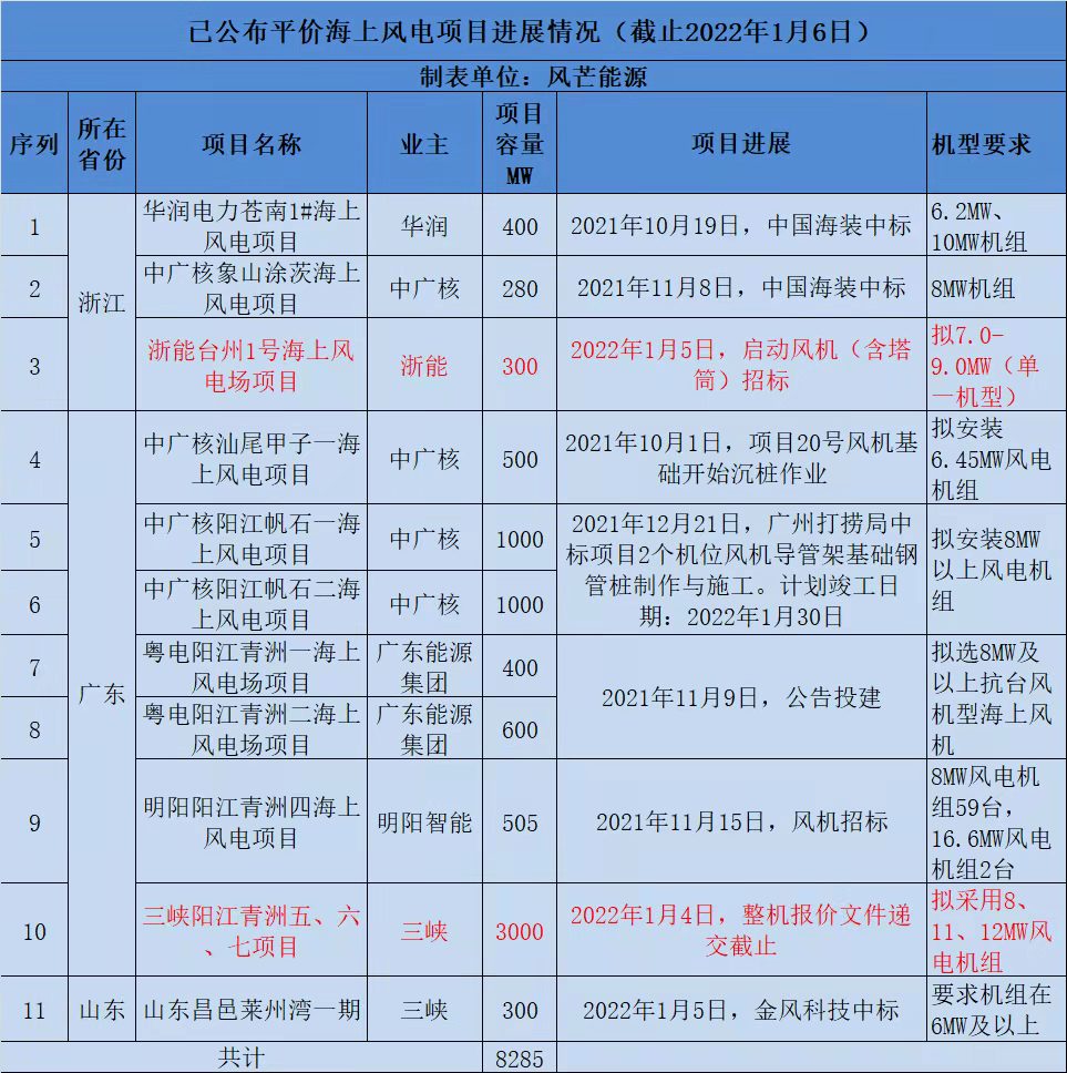 截至目前,公开信息显示已经有13个海上风电项目共计8.285GW陆续启动。这些项目机型要求全部是6MW及以上。明确要求机型在8MW及以上已不是少数。