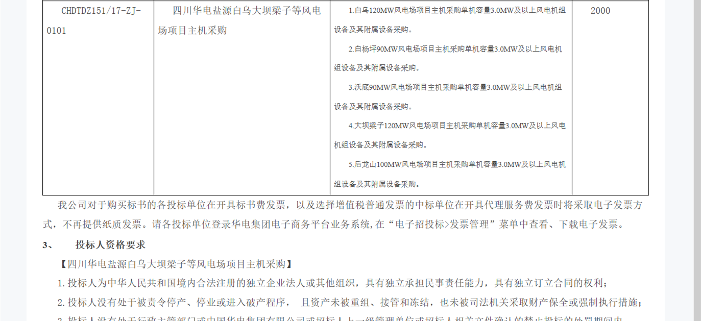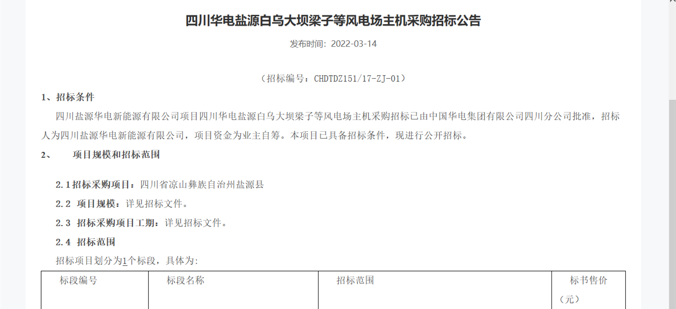 3月14日,华电集团发布四川华电盐源白乌大坝梁子等风电场主机采购招标公告。本次招标共划分一个标段,规模共计520MW,建设地点位于四川省凉山彝族自治州盐源县。