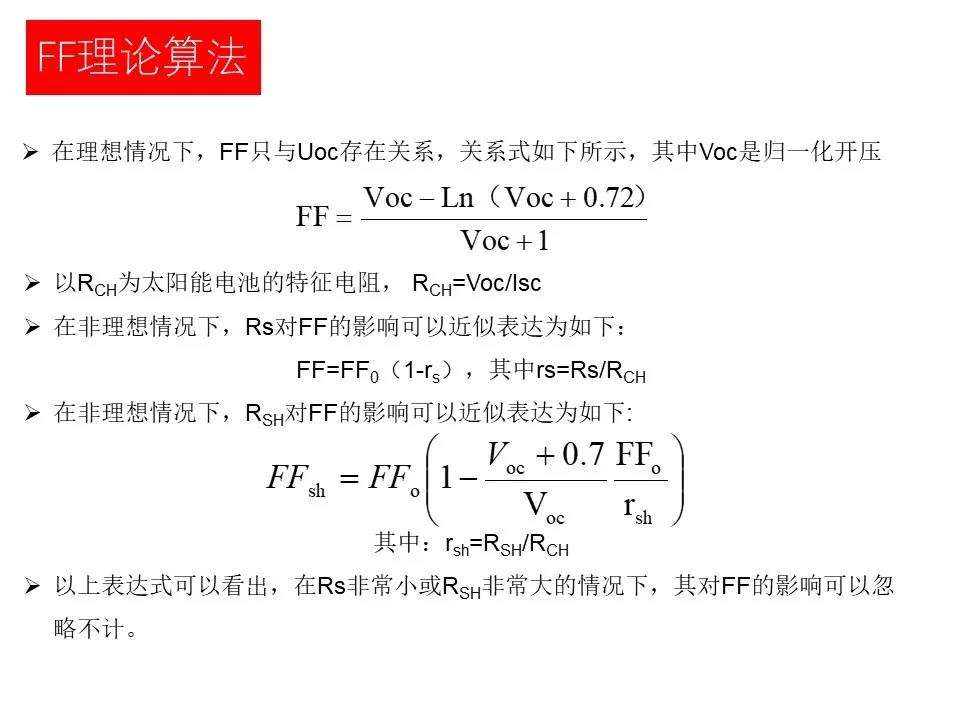 从图中可见,Isc附近曲线斜率与Uoc附近曲线斜率对FF影响极大,即FF大小受制于Rs与Rsh。