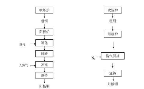 传统粗铜精炼技术与粗铜自氧化还原精炼技术的工艺流程对比见图1、图2。