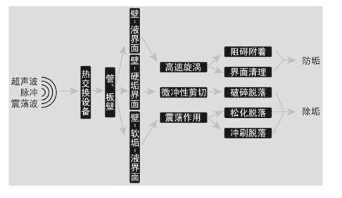 超声脉冲振荡波在换热器管、板壁传播,在金属管、板壁和附近的液态介质之间产生效应,破坏污垢的附着条件,防止换热设备在运行过程中结垢,提高换热设备传热能力,降低达到同样工艺要求所需的能耗量,实现节能目的。