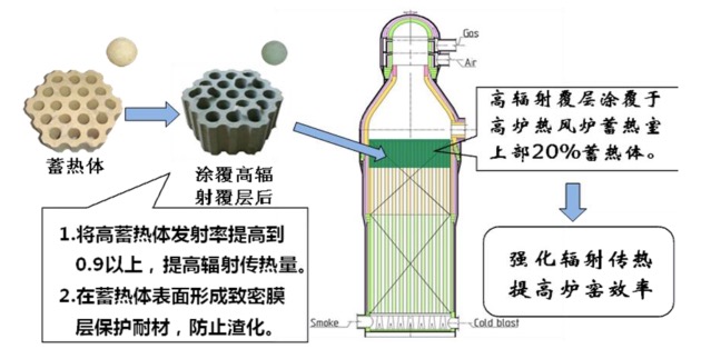 耐高温纳微米级高辐射覆层材料具有高辐射、高吸收的特性,将其涂覆在复杂结构的高炉热风炉与焦炉的蓄热体表面及燃烧室内壁,可以提高蓄热体和燃烧室立火道表面的发射率(从涂覆前的0.7-0.8提高到0.90以上),强化高温环境下固体表面与气体间的辐射传热,提高蓄热体的表面温度,加大表里温度梯度,增加了蓄热量,提升能源利用效率,降低燃料消耗。