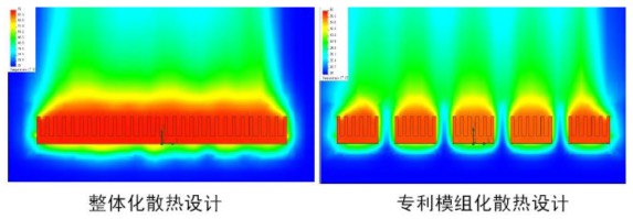 热分析分析结果表明,采用模块化的路灯结构设计,可强化空气对流散热效果,避免翅片温度过高,可有效降低翅片表面温度,温度的下降幅度在10oC以上,从而可显著提高灯具的使用寿命和稳定性。