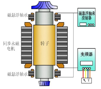 该创新技术采用一体化设计,其核心是磁悬浮轴承和永磁电机技术。同步永磁电机采用了无机械磨损的磁悬浮轴承技术,最大程度地降低了机械传动损耗,工作转速可达36000r/min。此外采用了专用变频器驱动,变频器驱动效率可达98.1%,结构示意图如图1所示。