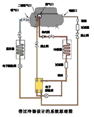 (4)双级压缩机补气增焓+过冷器技术,充分发挥双级压缩效果,利用独立过冷器提高冷媒过冷效果,提高单位冷媒制冷能力;