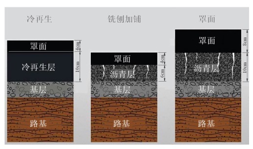 通过冷再生,可以消除原路面较深层位病害,延长路面寿命。典型的沥青路面冷再生结构形式见下图2。