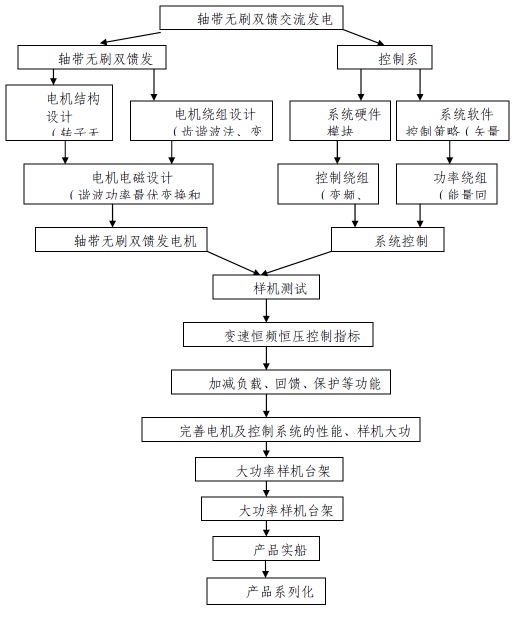 轴带无刷双馈交流发电系统开发流程及原理见图1、图2。