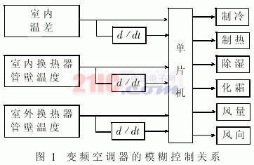 变频空调器采用模糊控制技术输入作模糊技术处理后,可实现对多变量的动态控制,其控制关系如图1所示。它包括三个输入量:室内温差及其随时间的变化率,室内热换器管壁的温度及其时间的变化率,室外热换器管壁的温度及其随时间的变化率。输出量包括对空调器和制冷、制热、除湿、化霜、风向、风量等功能实行智能化控制.