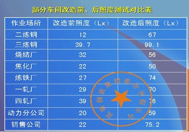 针对以上情况,雪莱特光电科技股份有限公司汇同云南省节能技术服务中心从昆钢生产照明使用的实际需要出发, 通过科学的设计, 力求创造一个高效、舒适、安全、经济、文明的生产工作环境,提高照明质量,提高能源利用率,满足生产的需要。根据国家标准GB50034-92《工业企业照明设计标准》,对昆钢的照明系统进行全面改造。
