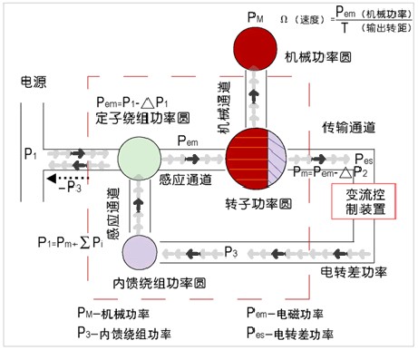 内馈电机是在电机内部特殊设置了内馈绕组,目的是接收从转子移出的电转差功率。内馈绕组处于发电状态,抵消了定子绕组的等量输入功率,使得P1=PM+Pi≈PM,从而实现电机高效率的节能运行。如下图,电机调速时,转子的部分功率通过电传导馈入内馈绕组,如果忽略损耗,内馈绕组所获得的功率与转子被移出的功率相等,表现在图中为转子功率圆部分面积与内馈绕组功率圆面积相等。由于转子的部分功率被移出,故转化的机械功率减小,因此电机转速下降;反之则相反。