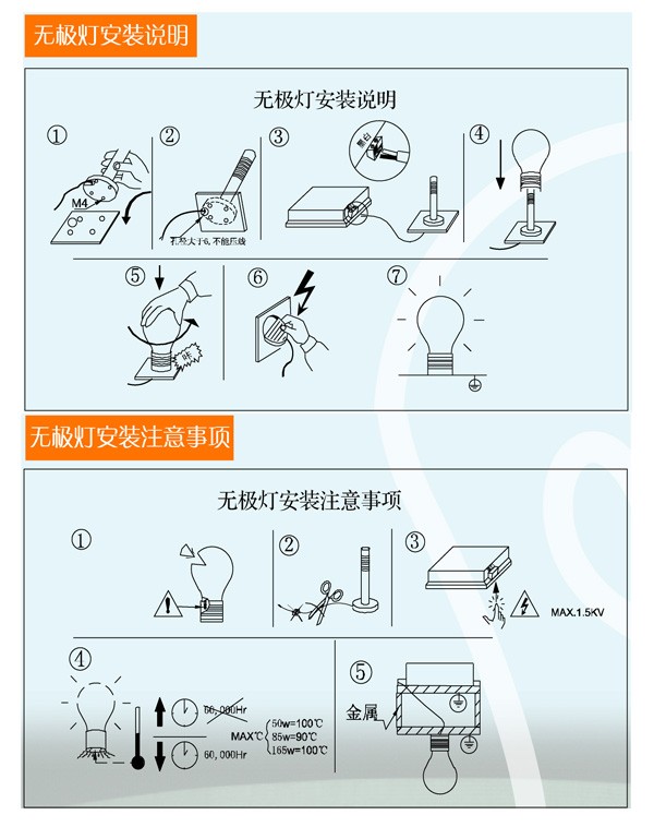 ● 灯具安装要求 1 )用户使用本公司光源产品时,必须采用本公司提供或认可的灯具,否则,因灯具选择不当无极荧光灯出现故障本公司概不负责; 2 )灯泡与灯具的固定装置必须连接牢固,紧密接触,以保证散热良好; 3 )灯泡、高频发生器在安装时应分别按要求接地; 4 )无论使用何种灯具,灯具外壳必须接地。