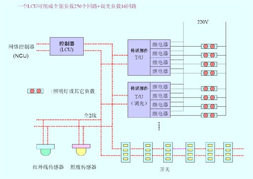 完全2线式照明控制系统由31个子控制中心组成(最大系统)。LCU是完全2线式照明控制系统中的子控制中心,能控制256个回路个别负载和16个回路的调光负载,按个别、群组、模式、计划或区域控制方式进行控制。一个全2线照明控制系统最大能带动8432〔(256 + 16)* 31〕个回路。