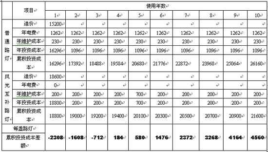 表2:普通路灯与风光互补路灯年度投资及运行成本对比分析表
