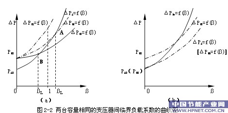 2. 4. 1. 2 若PAO < PBO及PAK > PBK,PAO + PBO < PAK +PBK时,解得L >1.ΔPA=f()与ΔPB2=f()交于图2-2(a)中的A点,此时变压器A优于B.此种情况下,只有变压器B满载以后时,变压器B才优于变压器A .在实际运行中,L >1时没有实际意义。