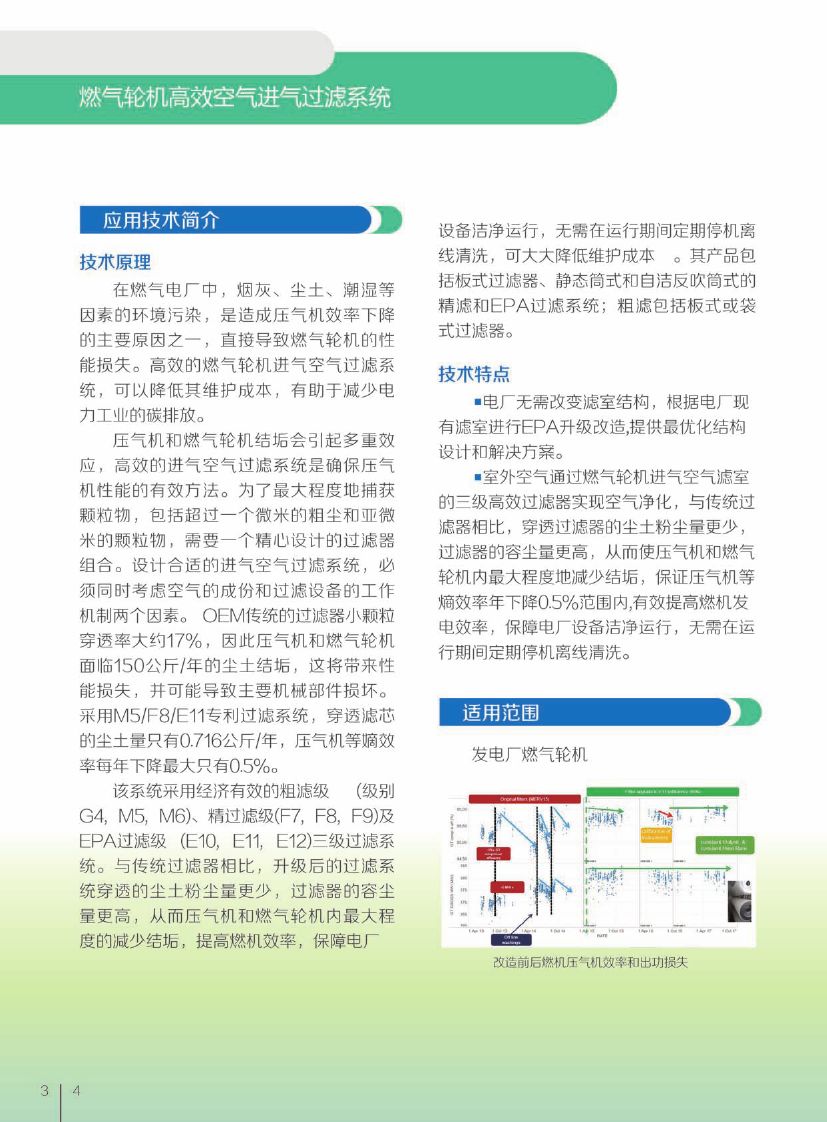 燃气轮机高效空气进气过滤系统技术将室外空气通过燃气轮机空气净化室的三级高效过滤器实现空气净化,达到燃气轮机空气净化要求,比传统高效过滤器净化程度高,降低了维护成本, 并保证压气机等熵效率年下降0.5%范围内,有效提高燃气轮机发电效率。