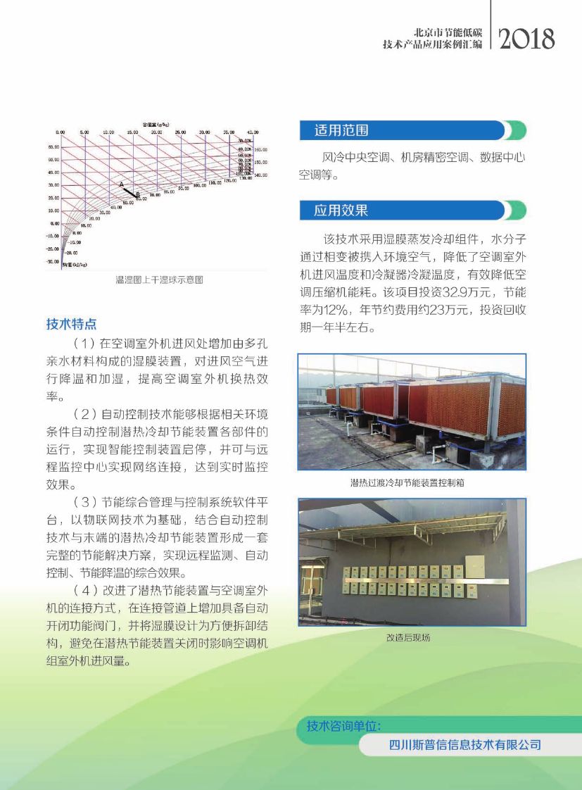 该技术采用湿膜蒸发冷却组件,利用相变将水分子带入环境空气,降低了空调室外机的进风温度和冷凝器的冷凝温度,有效降低空调压缩机的能耗,节电率12%左右。