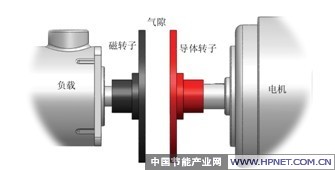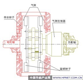 永磁调速器的结构,主要由两部分组成,一部分是安装在负载侧的磁转子,另一部分安装在动力机侧的铜转子,铜转子与动力机转速一致,在运行过程中保持不变。其工作原理:铜转子和磁转子可以自由地独立旋转,当铜转子旋转时,铜转子与磁转子产生相对运动,交变磁场通过气隙在铜转子上产生涡流,同时涡流产生感应磁场与永磁场相互作用,从而带动磁转子沿着与铜转子相同的方向旋转,结果是在负载侧输出轴上产生扭矩,从而带动负载做旋转运动。通过调节永磁体和铜导体之间的气隙就可以控制传递扭矩的大小,从而获得可调整的、可控制的、可以重复的负载转速,实现负载转速的调节。