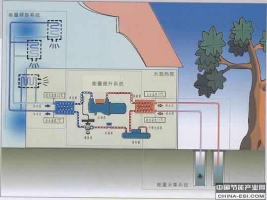 地球表面浅层水源(一般在1000 米以内),如地下水、地表的河流、湖泊和海洋,吸收了太阳进入地球的相当的辐射能量,并且水源的温度一般都十分稳定。水源热泵技术的工作原理就是:通过输入少量高品位能源(如电能),实现低温位热能向高温位转移。水体分别作为冬季热泵供暖的热源和夏季空调的冷源,即在夏季将建筑物中的热量“取”出来,释放到水体中去,由于水源温度低,所以可以高效地带走热量,以达到夏季给建筑物室内制冷的目的;而冬季,则是通过水源热泵机组,从水源中“提取”热能,送到建筑物中采暖。